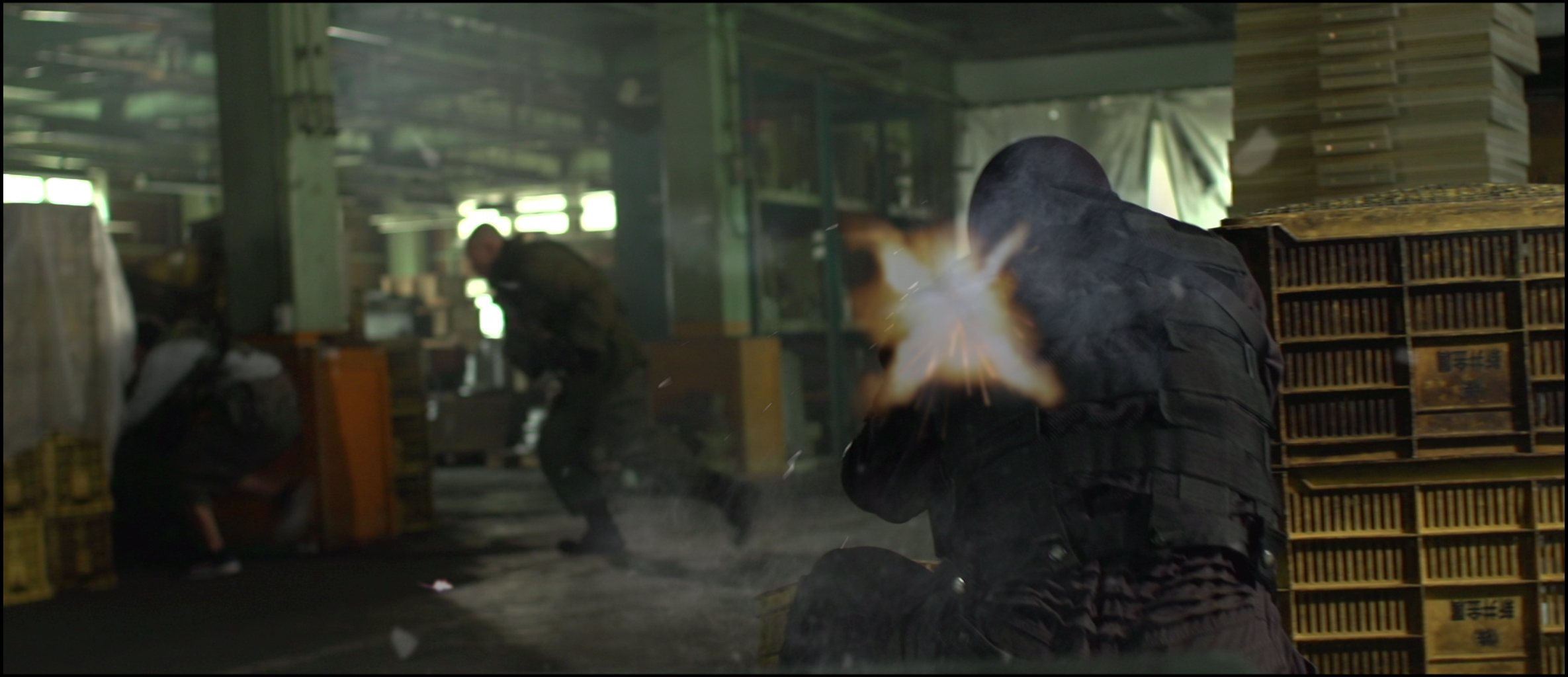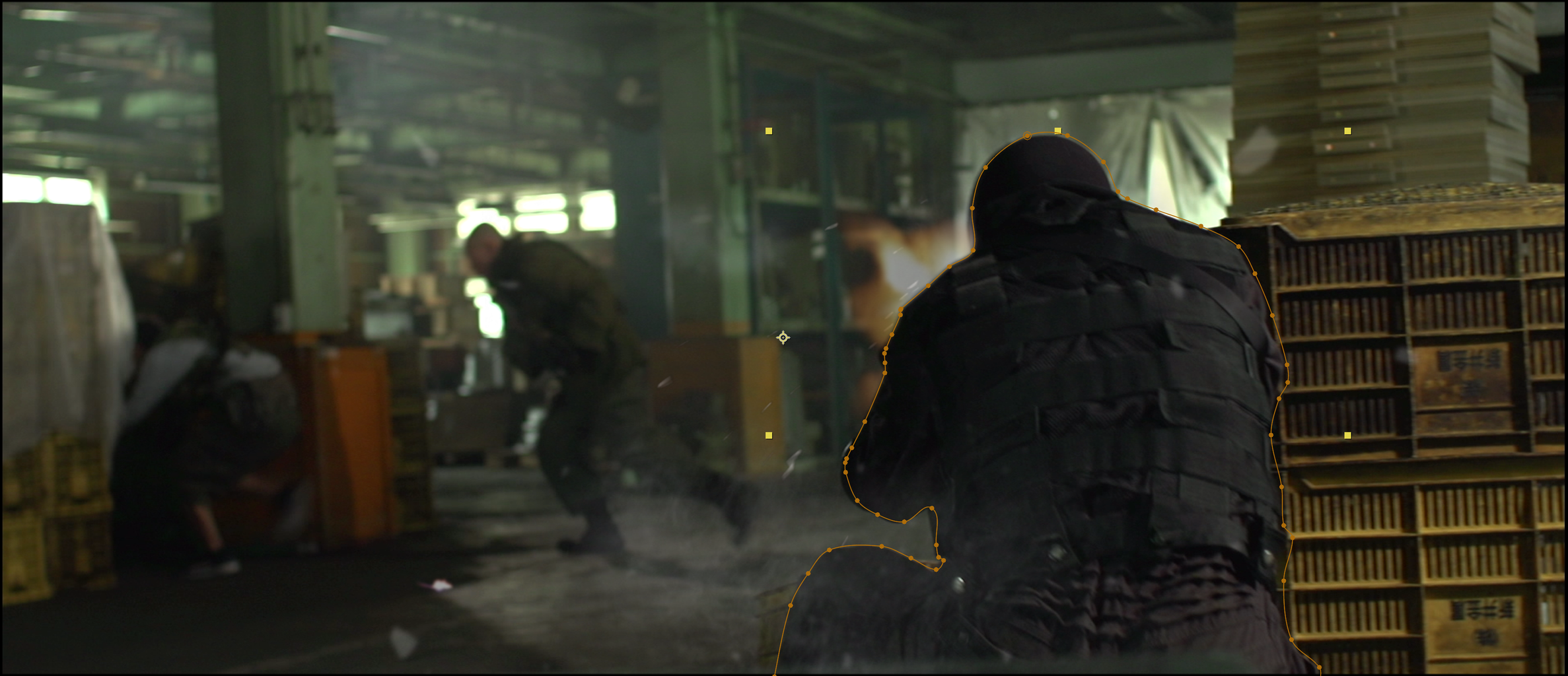 しかしながらこの萩田さん、まだまだ銃を撃ち続けますし、撃った後の煙はまだ残り続けているので次のフレームも切り抜かなければ行けません。